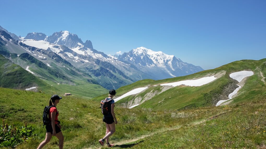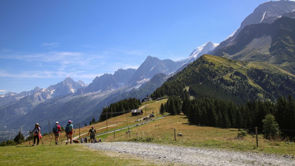 Unsere Wandertour um den Mont-Blanc beginnt in Les Houches. Vom Gipfel der Bellevue-Seilbahn haben Sie einen Panoramablick auf das Mont-Blanc-Massiv, die Aiguilles Rouges, die Fiz und die Aravis. Wir verlassen das Tal von Chamonix und wechseln in das Val Montjoie. Zwischen Almen und Wäldern führt uns der Weg zum Dorf Les Contamines. Übernachtung im Hotel. Positiver Höhenunterschied: 700m – Negativer Höhenunterschied: 1300m – Entfernung: 12km